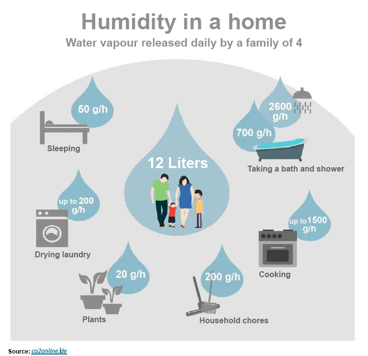 A cause for an increase in humidty are exhalations of the residents on one hand, on the other hand activities such as taking a shower or bath, cooking and sleeping create increased humidity. Breathing and sweating alone result in one litre humidity a day per person. Humidity is always changing, which is why residents are urged to monitor it regularly. Ideally, indoor humidity in winter is lower than in summer, because warm air generally absorbs more humidity than cold air. Hygrometers help identify relative humidity and take measures if required.